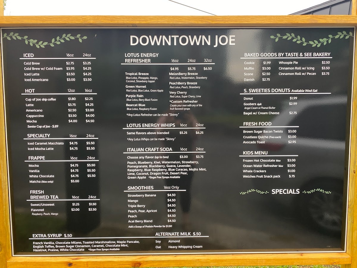 Downtown Joe offers a thoughtfully curated menu that blends simple café favorites with creative, comforting drinks. The selection is designed to suit relaxed mornings, casual meet-ups, or a refreshing pick-me-up any time of day. Whether you're stopping by for a well-crafted espresso or looking for a light, fresh bite, the menu balances familiar flavors with seasonal twists that fit the friendly, easy-going atmosphere.